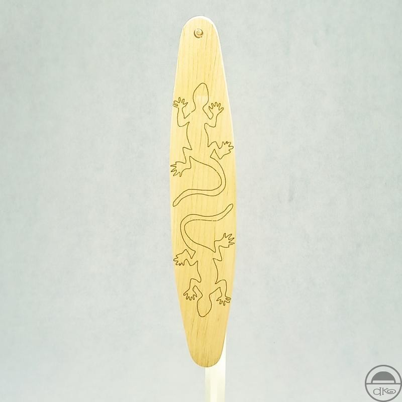 Na jedné straně je dřívko opatřeno laserem vypáleným motivem ještěrek.