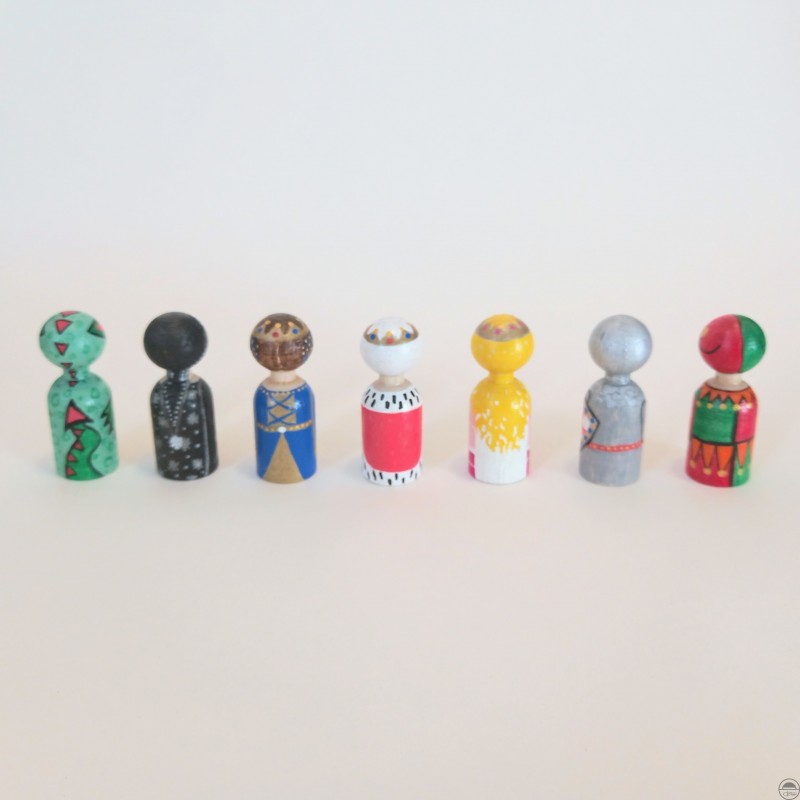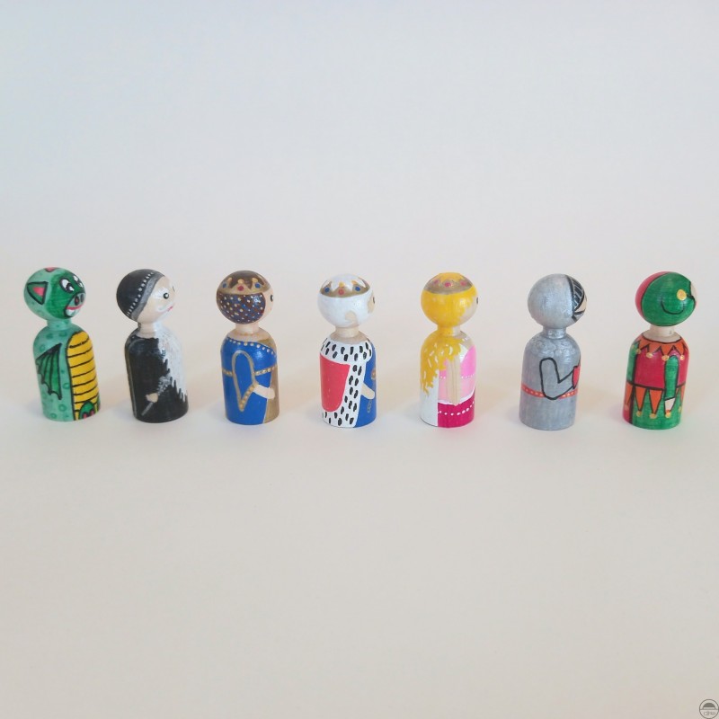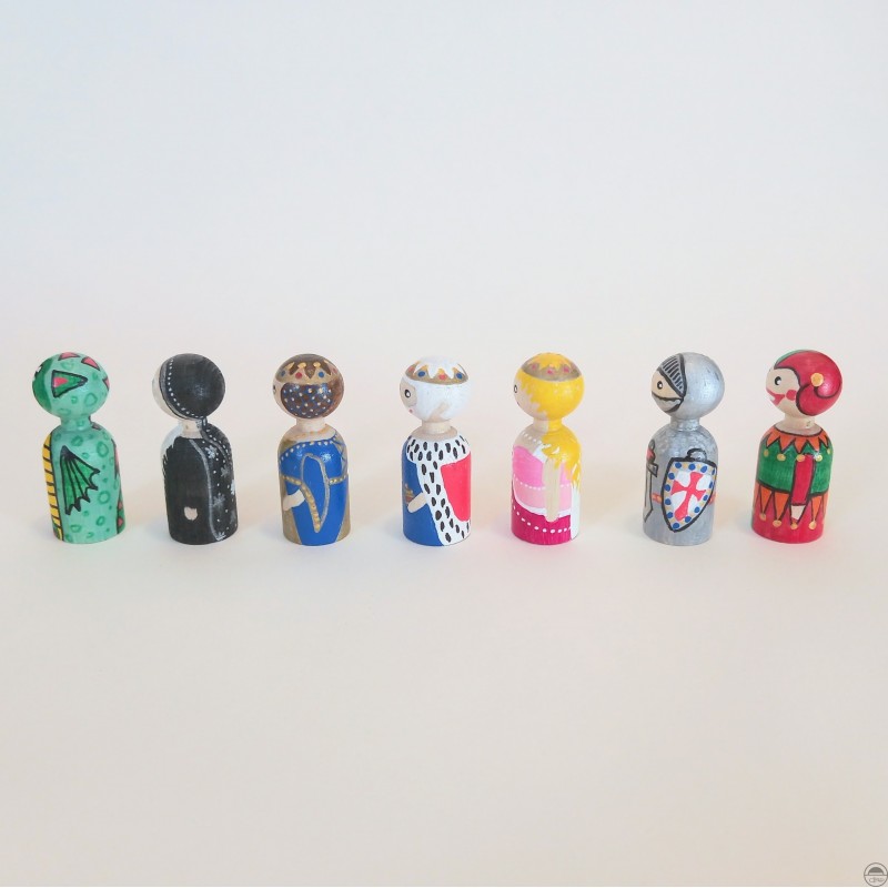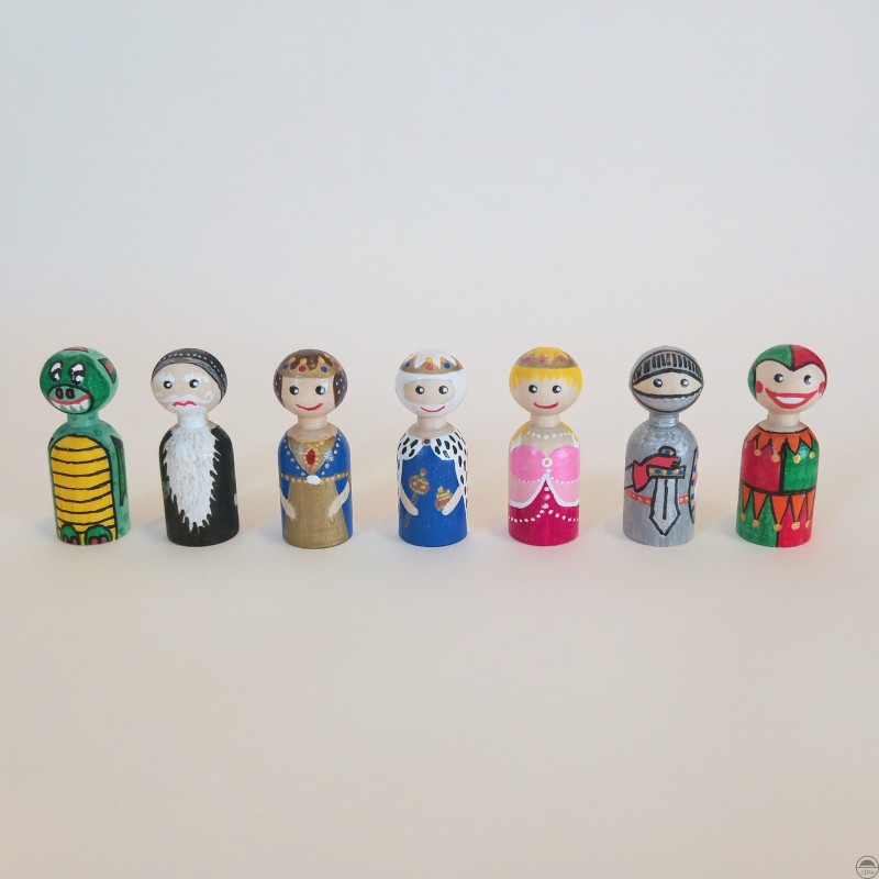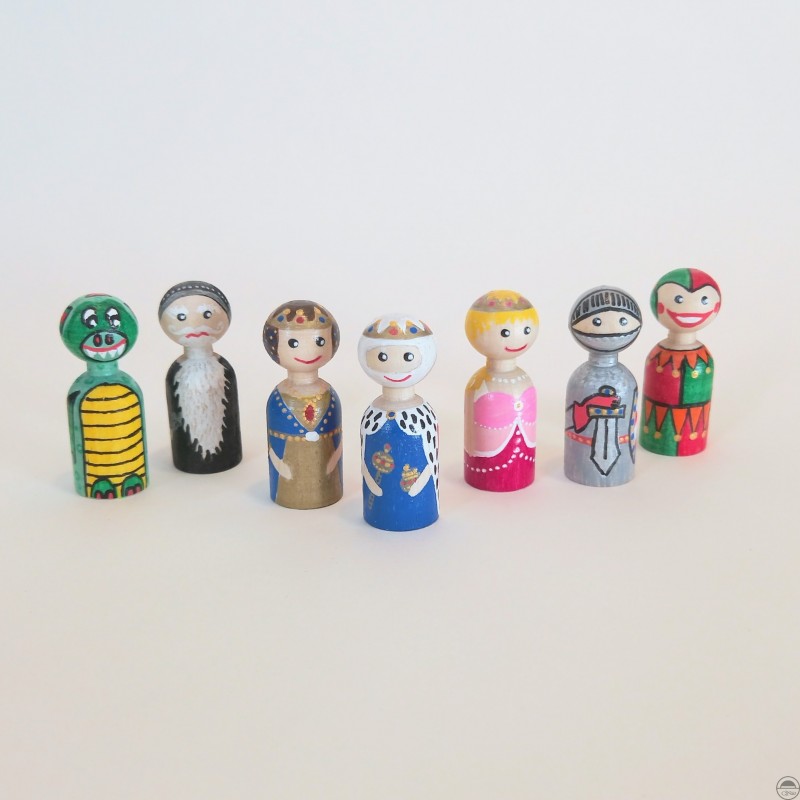 Sada obsahuje 7 kusů pohádkových postav (král, královna, princezna, rytíř, černokněžník, šašek, drak) ručně pomalovaných fixy s akrylátovou barvou a každá figurka je natřena bezbarvým lakem na dřevěné hračky a nábytek s atestem zdravotní nezávadnosti vyhovující normě EN 71-3/2021.