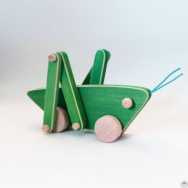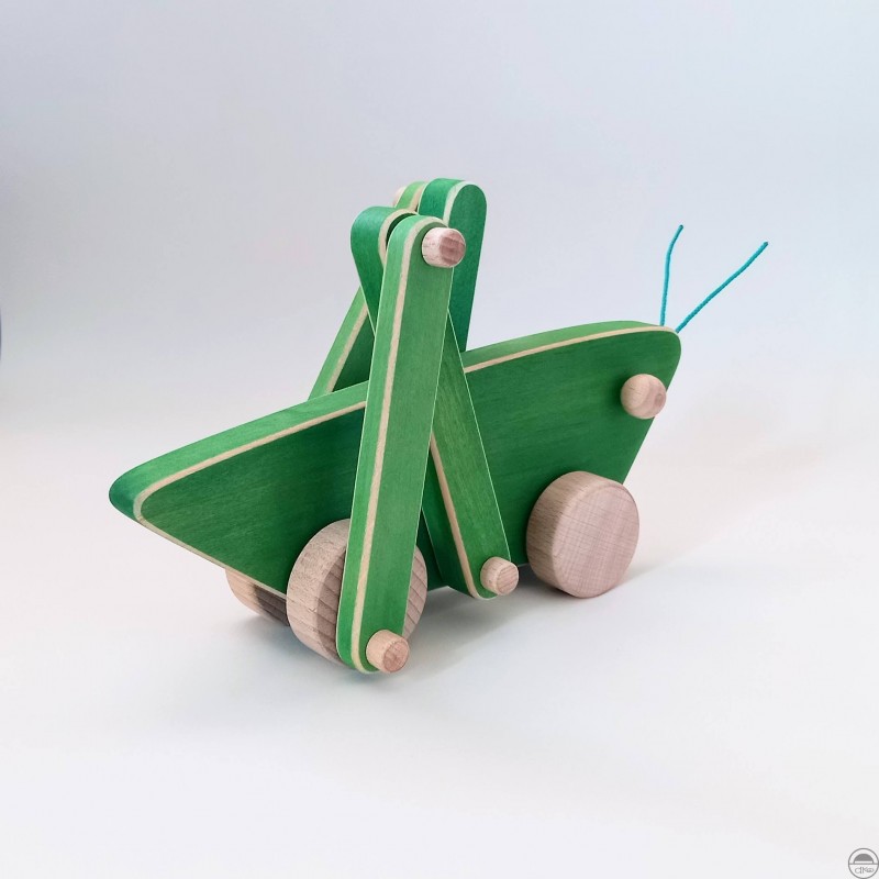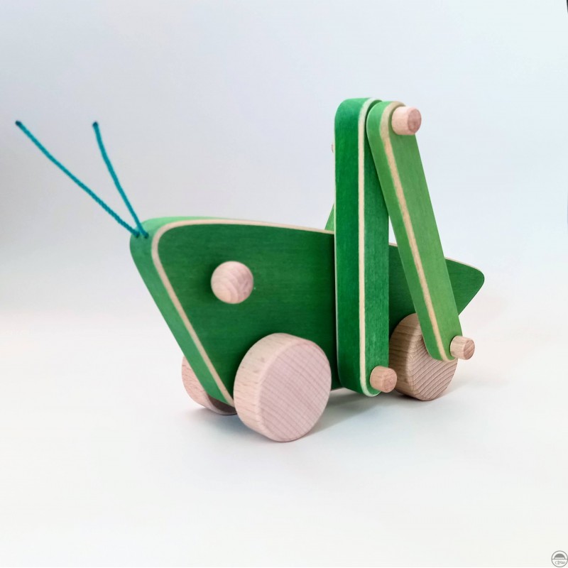 Luční koník TONÍK je ručně vyrobená dřevěná hračka - jezdící kobylka s kolečky, která při pohybu hýbe nohama.