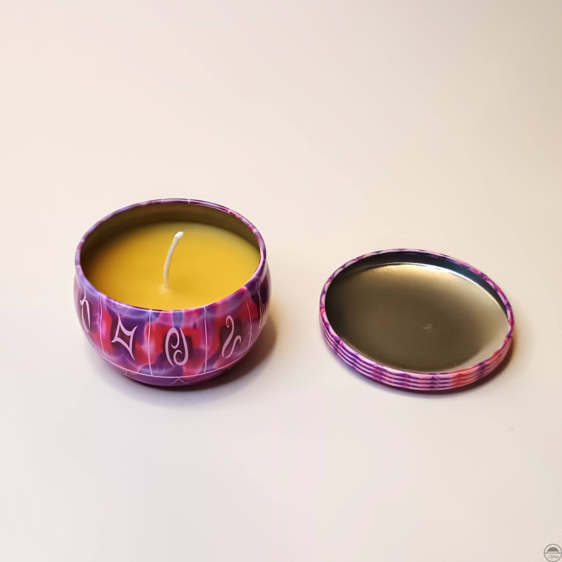 Vosk je nalitý do plechového kalíšku s různobarevnými vzory mandaly. Ideální jako dárek nebo jako dekorace.