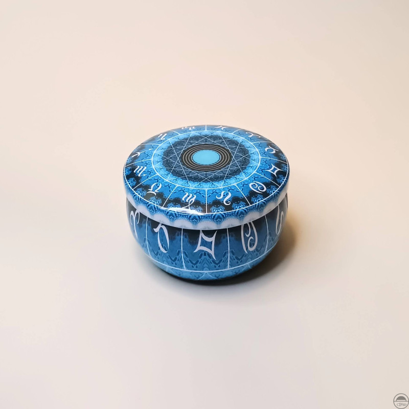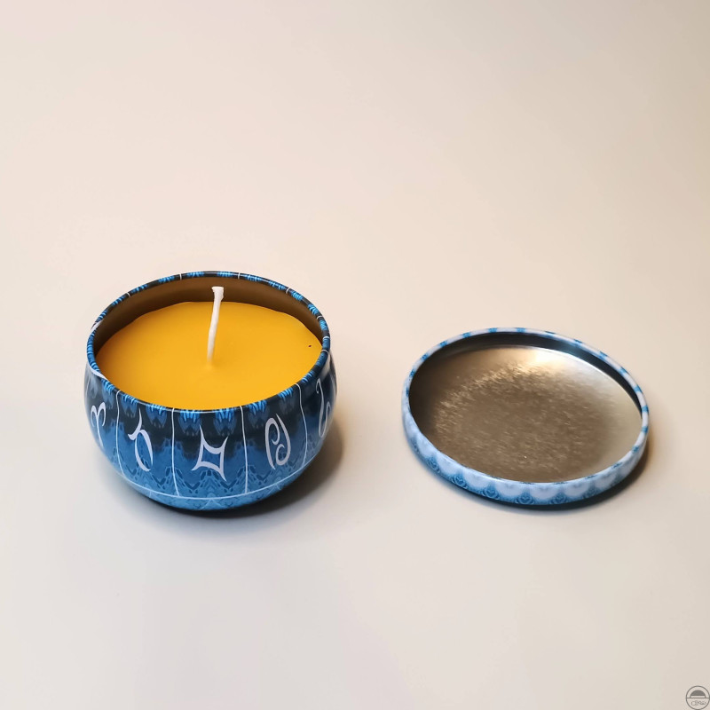 Vosk je nalitý do plechového kalíšku s různobarevnými vzory mandaly. Ideální jako dárek nebo jako dekorace.